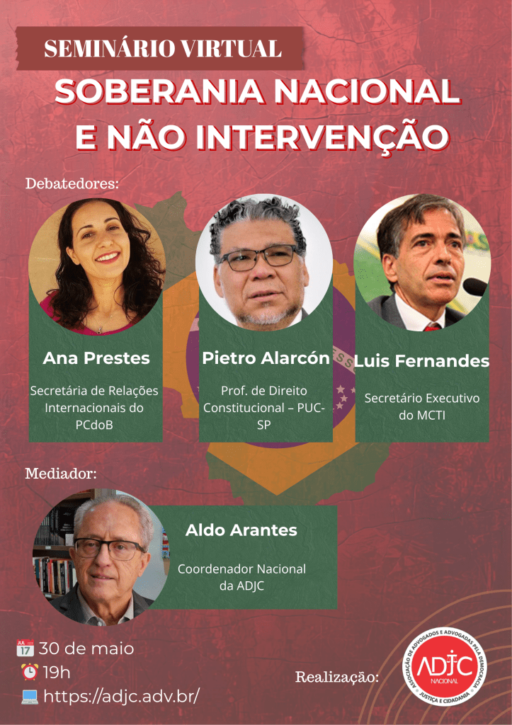 É com esse objetivo que a ADJC promove a live “Soberania Nacional e Não Intervenção”, reunindo importantes nomes do debate político e acadêmico para refletir sobre os desafios atuais e os caminhos possíveis para a defesa da soberania brasileira.